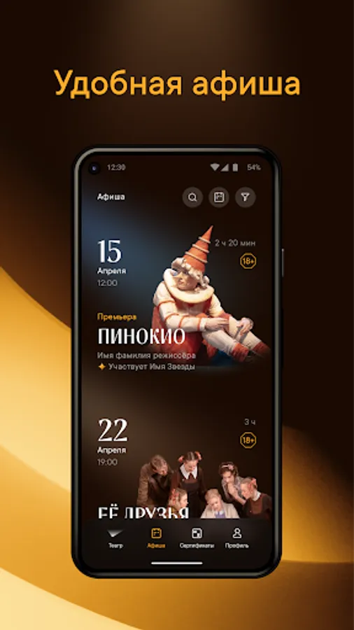 All sections of the official website are available in the application, which will help you be the first to know about premieres and keep abreast of the latest theater news. You can view photos and trailers of performances, read their synopsis, find out the line-up of performers and get acquainted with their biographies, as well as create your own list of favorite productions.