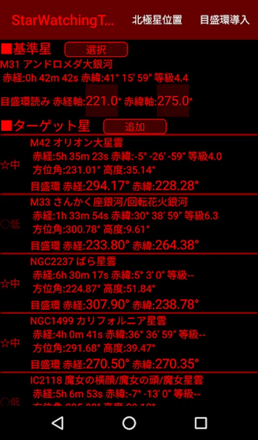 登録した基準となる星の目盛環の読みから、導入したい星の目盛環の値を表示します。
