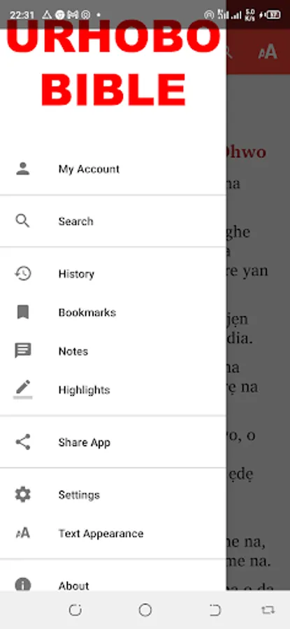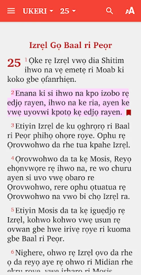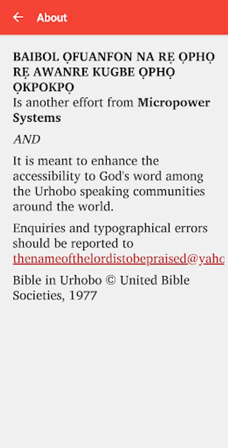 BAIBOL ỌFUANFON NA RẸ ỌPHỌ RẸ AWANRE KUGBE ỌPHỌ ỌKPOKPỌ is the Urhobo version of the Holy Bible. It is free to use and contains no add.