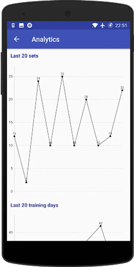 Simple analytic dashboards will give you an overview of your last 20 training days and last 20 sets.