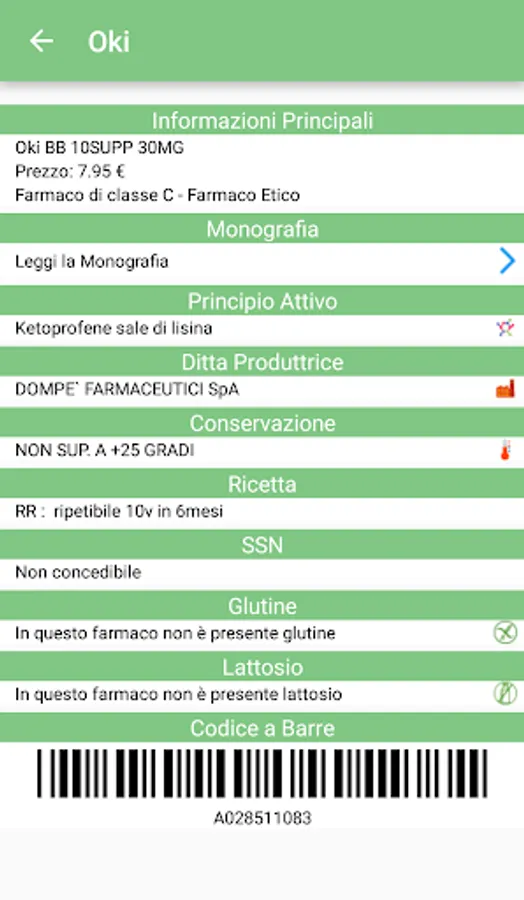 Once the drug of interest has been chosen, it is possible to view the details and consult the illustrative leaflet (requires internet connection).