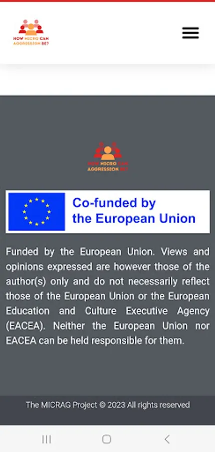 The MICRAG Mobile App is a result of the MICRAG – How 'micro' can aggression be? Erasmus+ Cooperation partnerships in vocational education and training (KA220-VET) project, developed thanks to the co-funding of the European Commission – Erasmus+ Programme (National Agency Education & Training of Netherlands). This app is designed to make all the contents of the project more accessible to learners through smartphones and mobile devices. This way learners can learn wherever and whenever they desire.
