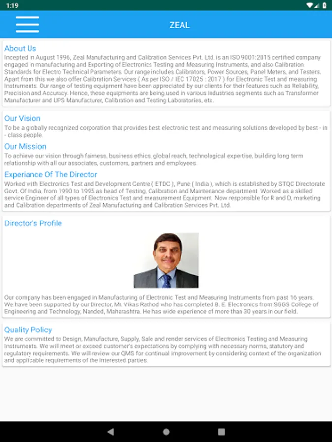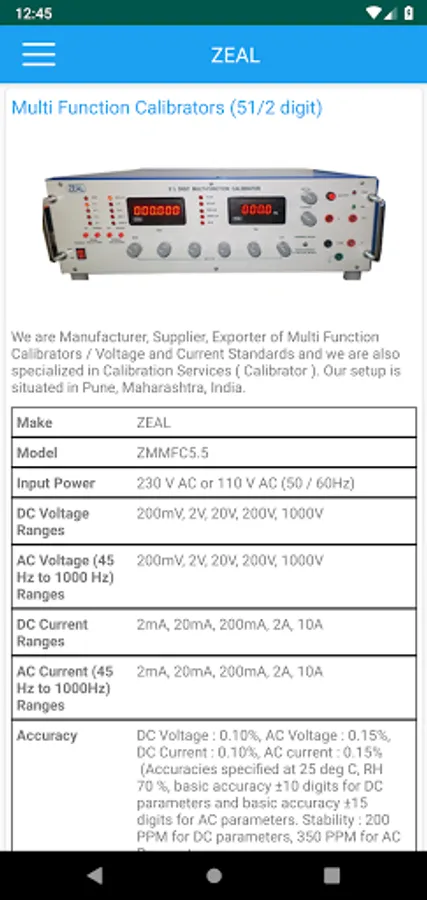 Zeal Manufacturing & Calibration Services Pvt. Ltd. Company, which is an ISO 9001:2015 certified company engaged in manufacturing & exporting of Electronics Testing & Measuring Instruments, and also Calibration Standards for Electro Technical Parameters. Range of products includes Calibrators, Power Sources, Testers and Meters. The company is pioneer in manufacturing of Electro Technical Calibration standards e.g. Multi function Calibrator, Three Phase Power Energy Meter Calibrator etc. in India, Calibrators have been supplied to Calibration Laboratories, Testing Laboratories in Govt / semi Govt / Private / Multinational organizations in India and abroad. Company manufactures testers like AC & DC High Voltage Breakdown Testers, Insulation Resistance Testers, Ground Continuity Testers etc. Company manufactures Power Sources like DC Regulated Power Supplies, Variable Frequency Sources, DC High Current Sources and AC High Current Sources. Company also undertakes manufacturing of customized test equipment.