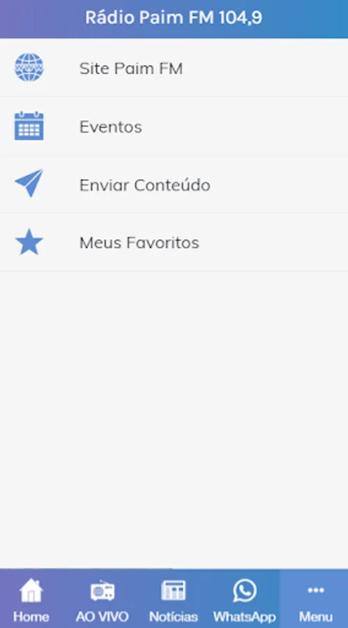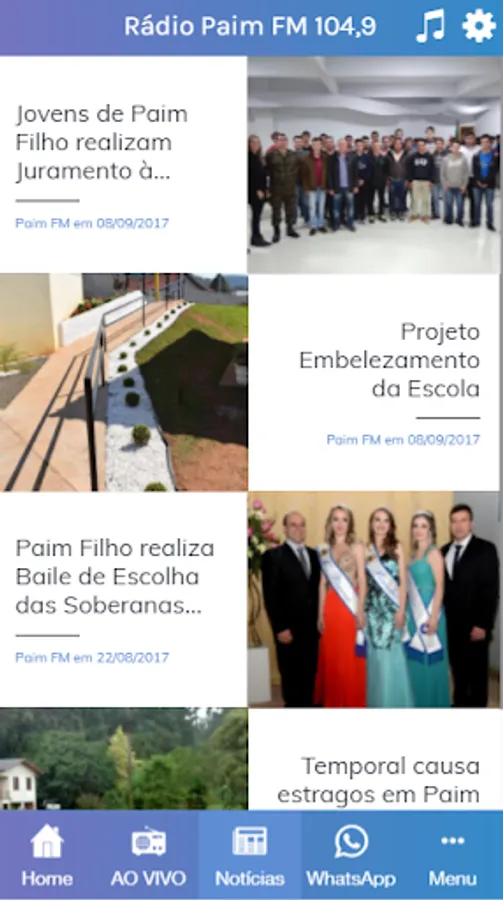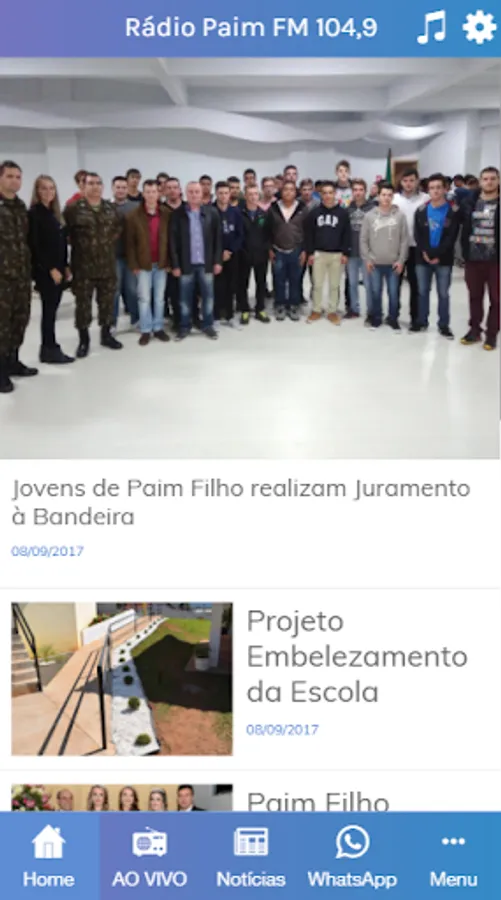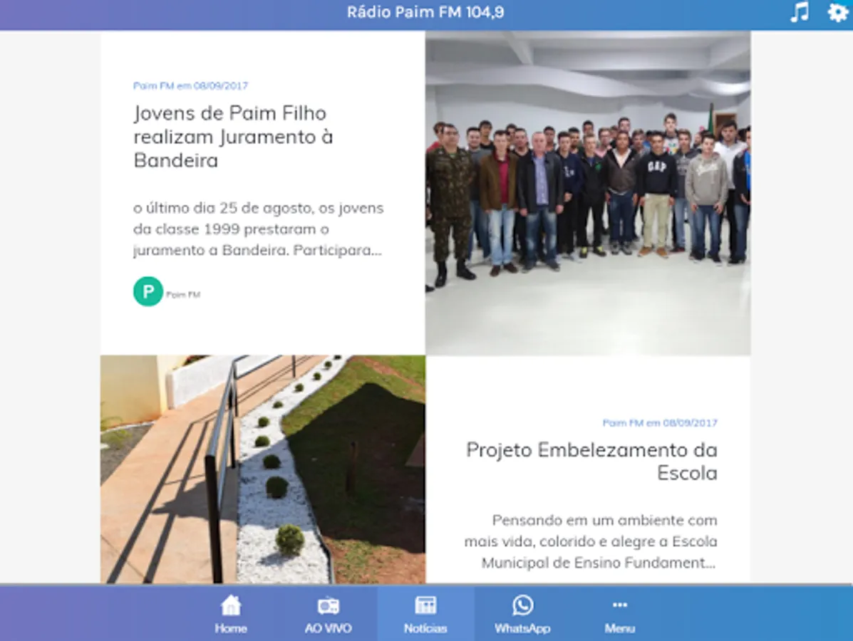 Paim Radio FM 104.5 radio station founded in September 1, 2010 with headquarters in Paim Filho, RS, with its young and updated schedule. In this app you can learn more about the radio employees, see the pictures of the facilities, events and other photos in the gallery will be able to interact with the radio sending a message or calling your music through the links and contact area will be able to check the local and regional events and also find the main information of the city.