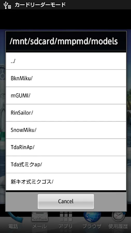 SDカードのmmpmd/modelsフォルダ : ネット上のモデル(pmd/pmxモデル)を入れます。 上方向、長めにドラッグし、離さず長押し3秒でモデル