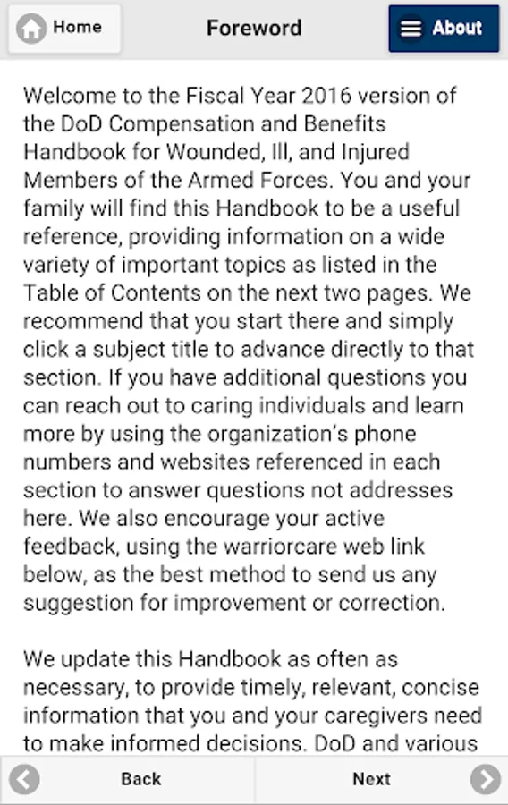 The Handbook was compiled in cooperation with the Departments of Veterans Affairs, Labor, Health and Human Services, and Education and the Social Security Administration, along with the military services. It also provides references to assistance provided by other governmental and non-governmental agencies and organizations. Many of the answers to specific questions will depend on the Service member’s personal circumstances. Service members should take advantage of the assistance of their Army Wounded Warrior Program (AW2) Advocate, Marine Corps Wounded Warrior Regiment or Air Force Wounded Warrior Program Recovery Care Coordinator (RCC), Navy Safe Harbor Non-Medical Care Manager (NMCM) or Federal Recovery Coordinator (FRC) to help find the answers to questions or contact the appropriate experts.