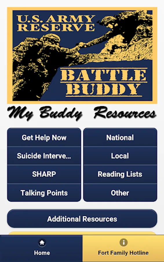 This app helps you be good Battle Buddy by giving you the tools and information needed to assist your buddy during a crisis. It also provides tips and tools to help you intervene before the situation reaches crisis proportions. This app is organized into two primary areas, “My Buddies” and “My Resources”.