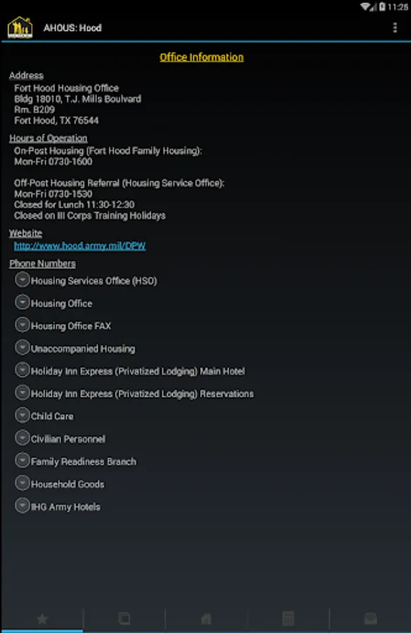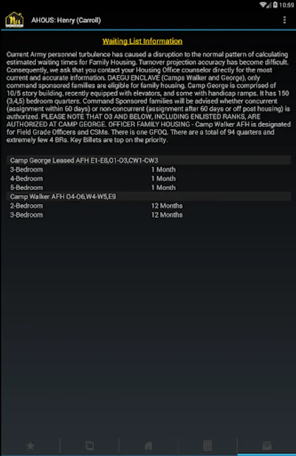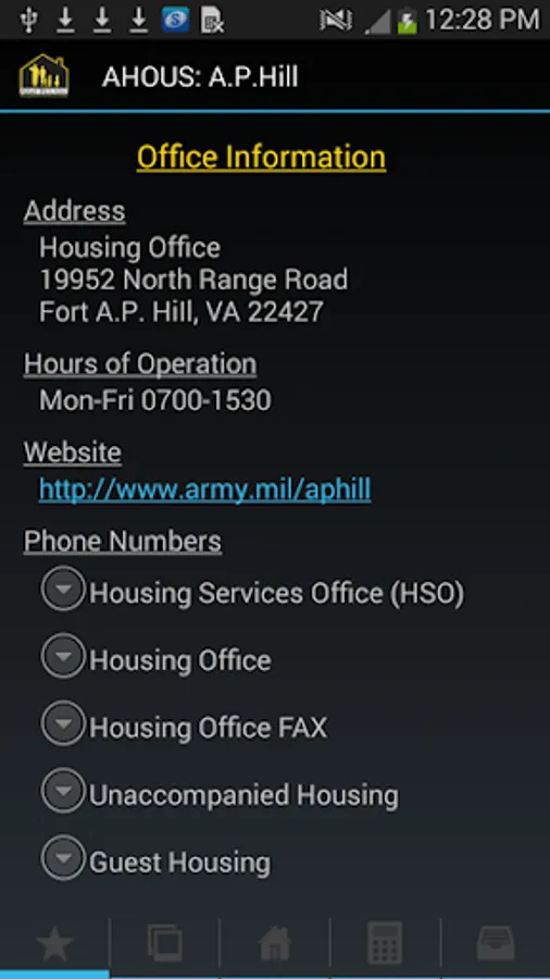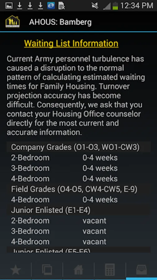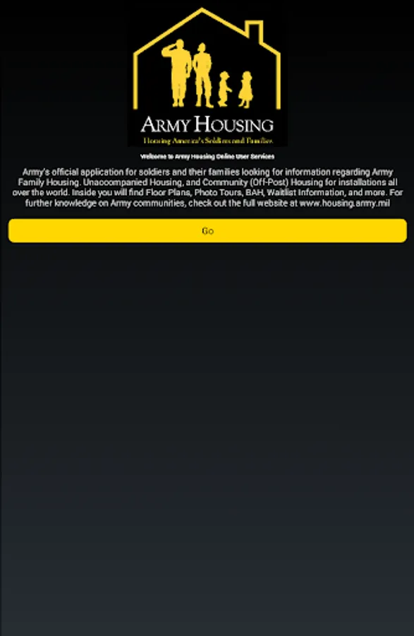 Army Housing Online User Services (AHOUS) is the Army's official Android App for soldiers and their families looking for information regarding Army Family Housing, Unaccompanied Housing (UH), or Community (Off-Post) Housing. It includes detailed reference information and quick links for Army installations all over the world.