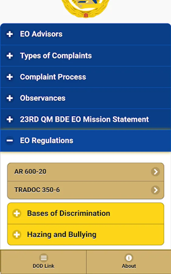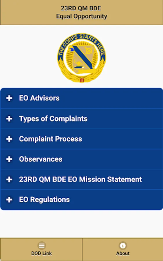 The 23rd Quartermaster Brigade Equal Opportunity App is designed to educate Soldiers, leaders and families within the 23rd Quartermaster Brigade and the Quartermaster School on the Army's Equal Opportunity (EO) Program. The app includes emergency phone numbers for the 23rd QM BDE EOA, Battalion EO Leaders and the Installation Senior EO Hotline.