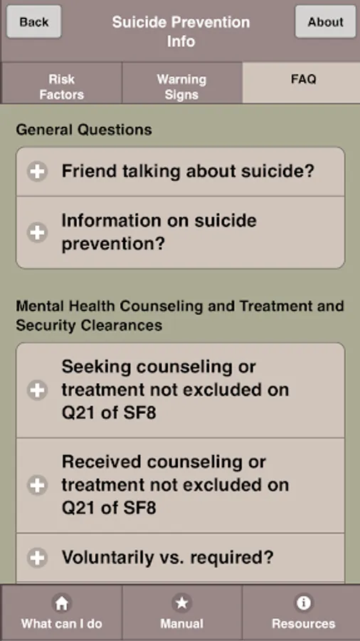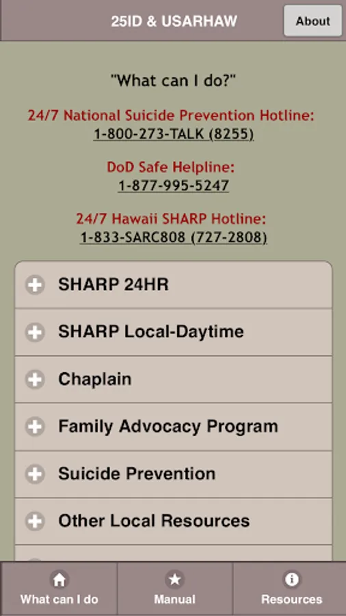 This app is to support the Suicide / Sexual Assault Prevention Campaign and serves as an educational and resource tool to reduce high risk behaviors with the ultimate goal of eliminating sexual harassment and sexual assault amongst our ranks.
