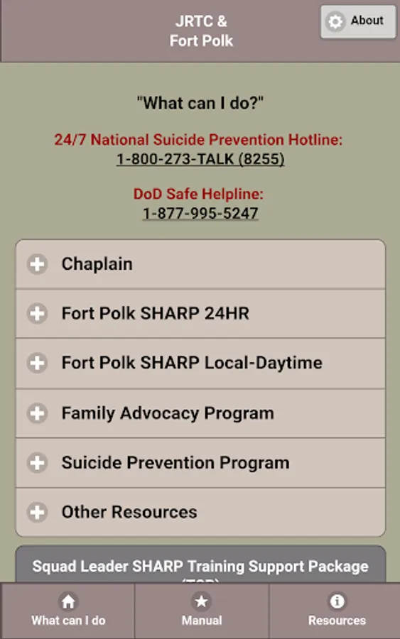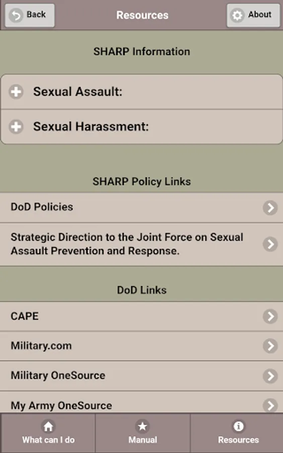 This app is to support the Suicide / Sexual Assault Prevention Campaign and serves as an educational and resource tool to reduce high risk behaviors with the ultimate goal of eliminating sexual harassment and sexual assault amongst our ranks.
