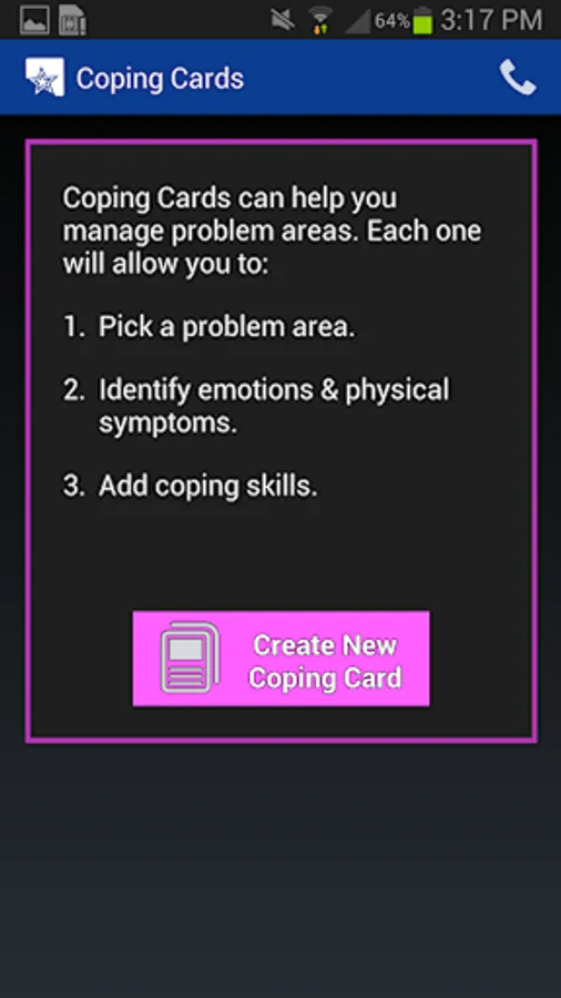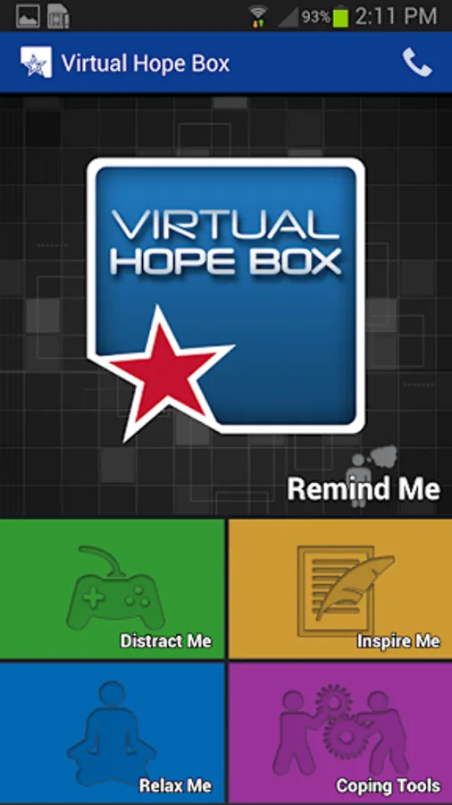 The Virtual Hope Box (VHB) is a smartphone application designed for use by patients and their behavioral health providers as an accessory to treatment. The VHB contains simple tools to help patients with coping, relaxation, distraction, and positive thinking. Patients and providers can work together to personalize the VHB content on the patient's own smartphone according to the patient's specific needs. The patient can then use the VHB away from clinic, continuing to add or change content as needed.