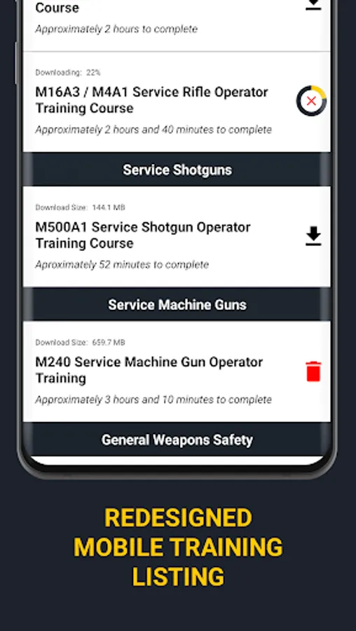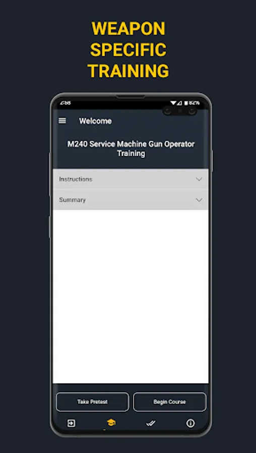 The seven training courses listed below cover safety, marksmanship, maintenance and operations, along with weapon-specific technical information. The purpose of the Personal Firearms Safety and Guidelines course is to teach about personal firearms safety, and this training does not include post-tests.