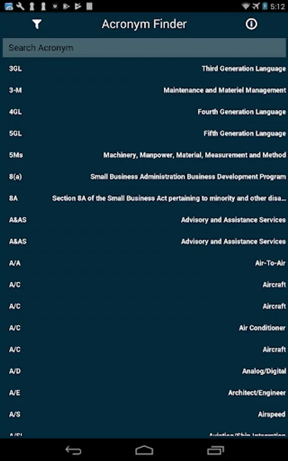NAVAIR Acronym Finder gives users a quick way to lookup NAVAIR acronyms that are used in their day-to-day work environments. Users will have the ability to filter down to a particular source of an acronym list in order to make searching more precise and relevant.