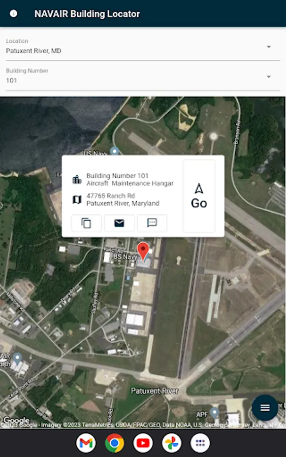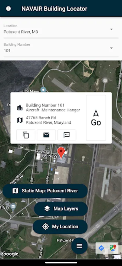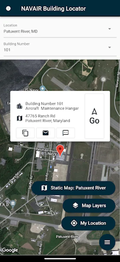 NAVAIR Building Locator is the go to mobile application in order to find where you need to go on any NAVAIR base. This application allows you to search any building number and gives you the ability to immediately navigate using Google Maps, or email/text directions to a friend.