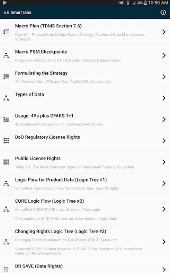 The SmartTabs mobile app is a Navy/Marine Aviation's "Best Practices" and "Lessons Learned" desktop reference set of visual aids constructed using the Department of Defense Acquisition Regulation Supplement (DFARS) requirements for participants dealing with Product Data/Technical Data (PD/TD) and their associated Intellectual Property (IP) (commonly known as "Data Rights"). These Best Practices graphically represent a compendium of most commonly encountered PD/TD IP related planning, acquisition, marking, reporting, and alternatives mitigation situations (so it fits most- but not all- situations). SMART TABS illustrates simplified concepts and decisional tools treating PD/TD related IP's: (i) management planning, assessment, and alternatives reporting, (ii) decisional logic trees associated with most commonly encountered IP pathways as part of creation, acquisition, usage rules and issues (including potential mitigation alternatives), (iii) conformal assertion markings samples (AKA "Stickers") using "Best Practices" treatment, and (iv) references and links for practitioners, including its supplementation to the Data & Rights Sustainment & Acquisition Validation Engine (DR SAVE) toolset.