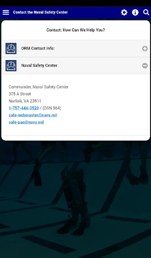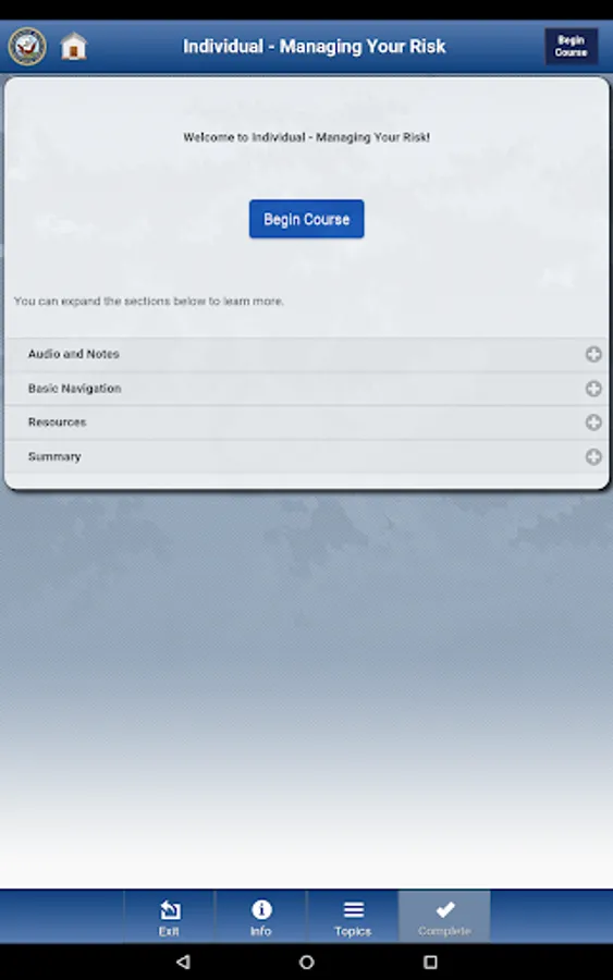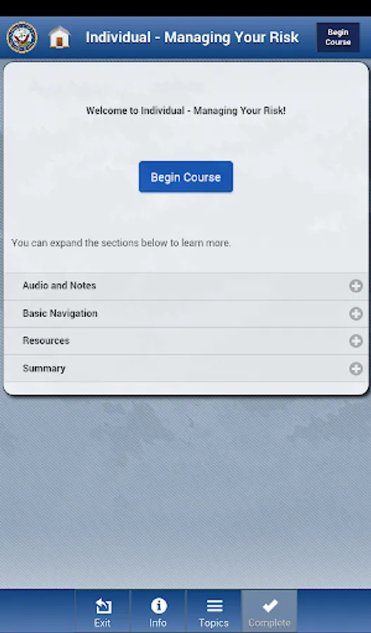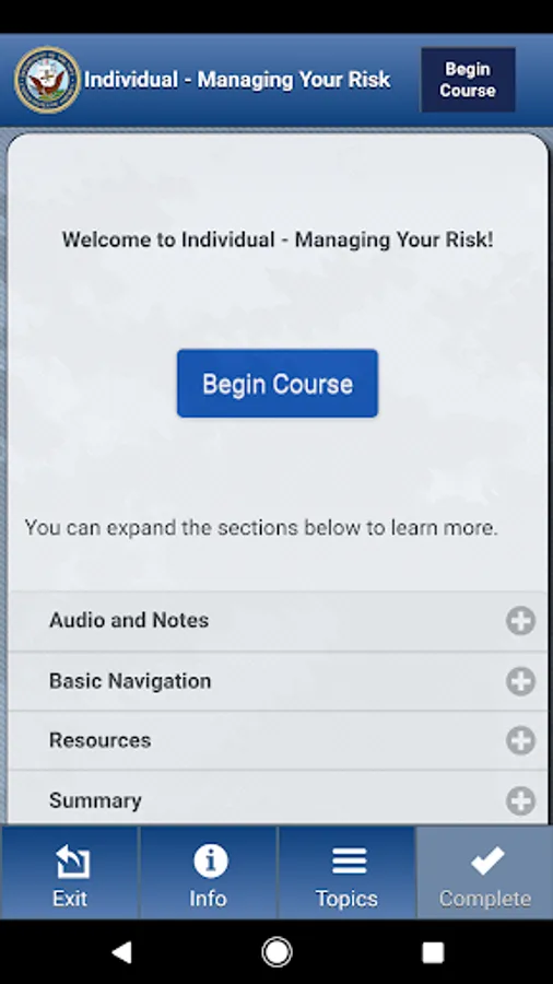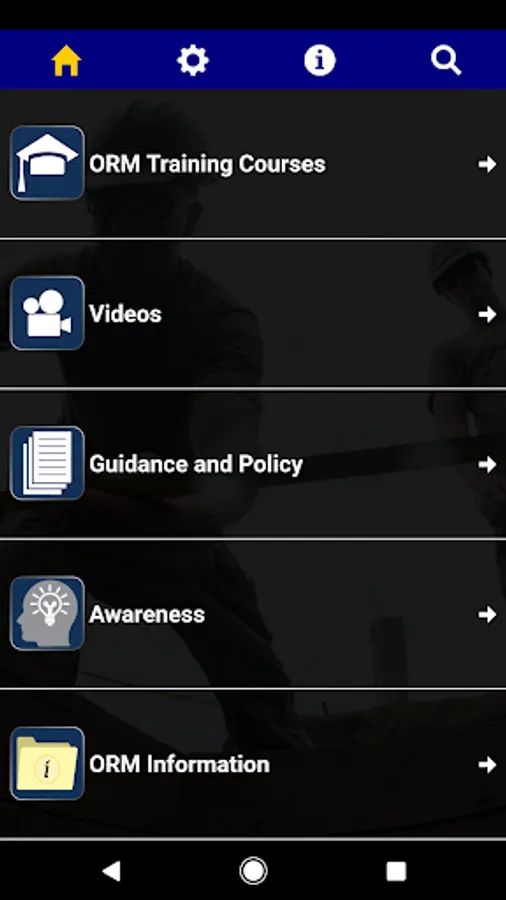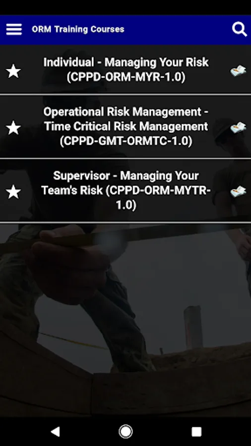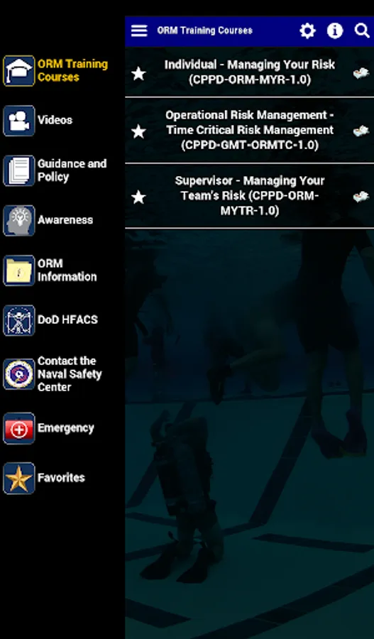 The Operational Risk Management app, or ORM app, offers users three risk management courses developed by the Naval Education and Training Command and the Naval Safety Center. These courses teach users ways to avoid and mitigate various types of risk when performing Navy tasks, missions, and operations, as well as risk in their personal activities.
