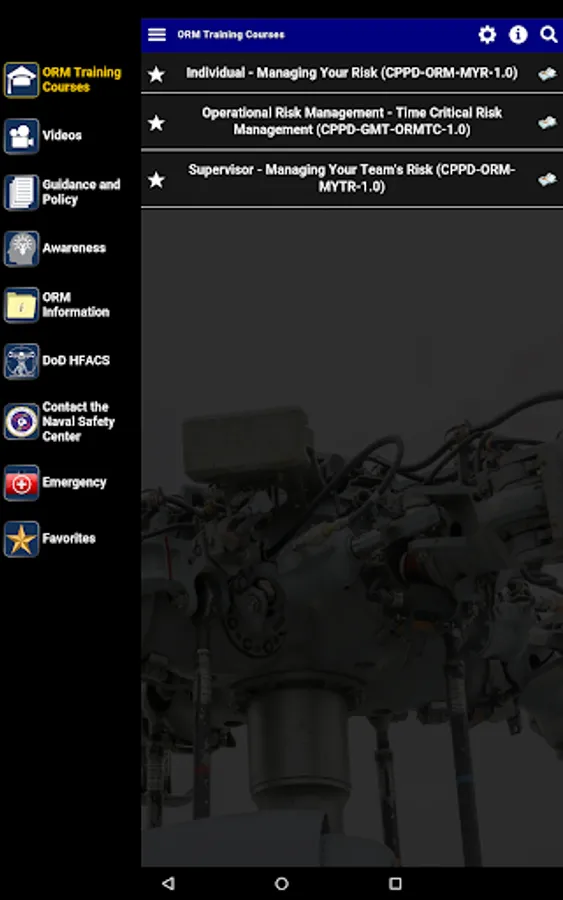 In addition to these training courses, the ORM app includes Videos, Guidance and Policy, Awareness Presentations, ORM forms and Risk-related Materials, DoD HFACS (Human Factors Analysis and Classification System) information, Lessons Learned, and related tools and materials.