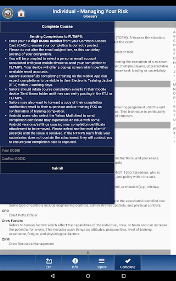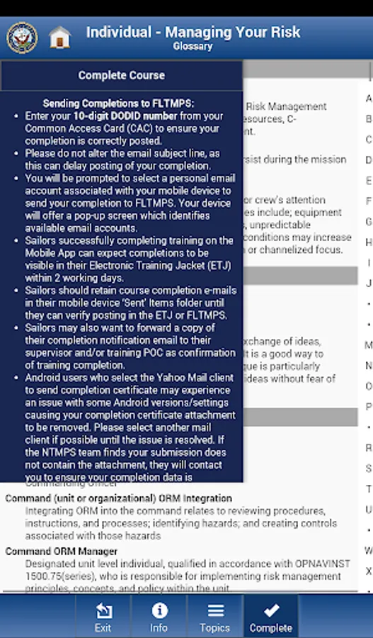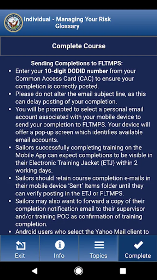 • DON personnel may use the app to complete their annual mandatory training. End-of-course completions can be emailed to Navy Training Management and Planning System (NTMPS) for display in the Electronic Training Jacket (ETJ).