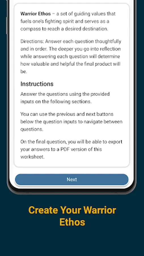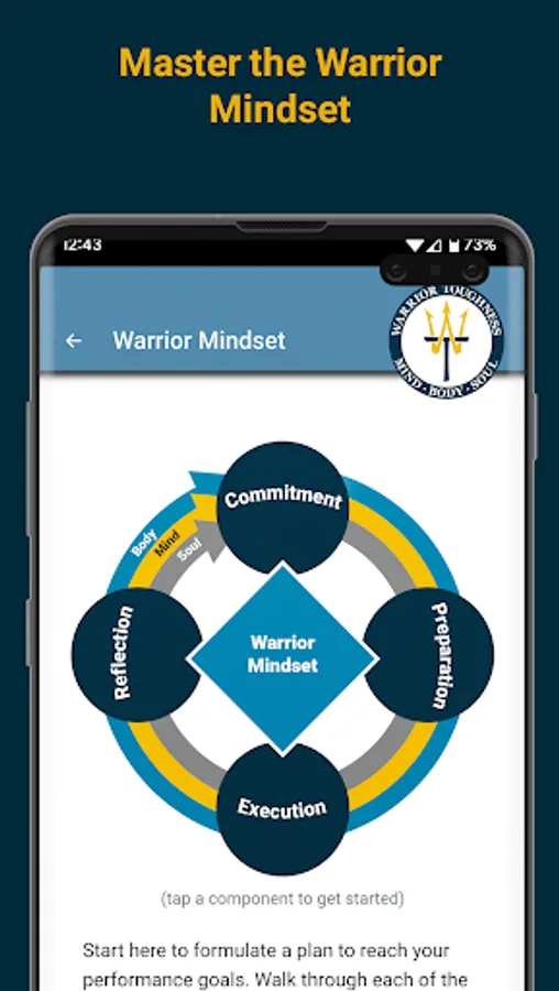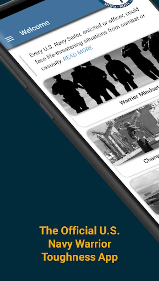 The Warrior Toughness app includes the Warrior Mindset guided program, as well as exercises and exportable worksheets that allow Sailors to save and track their progress. The Warrior Toughness app is divided into three main sections: