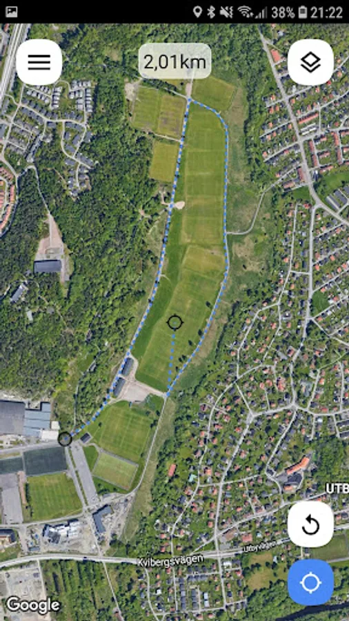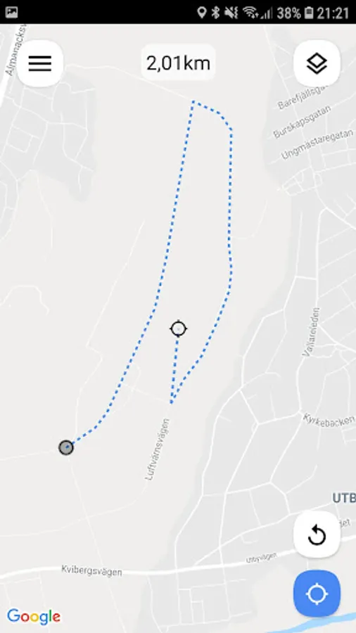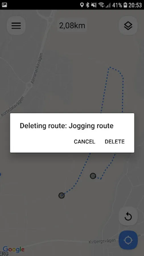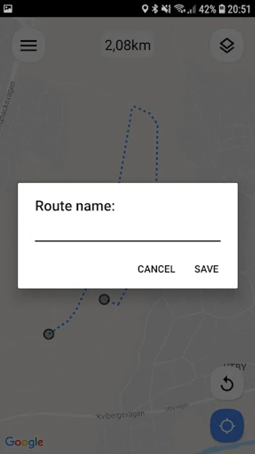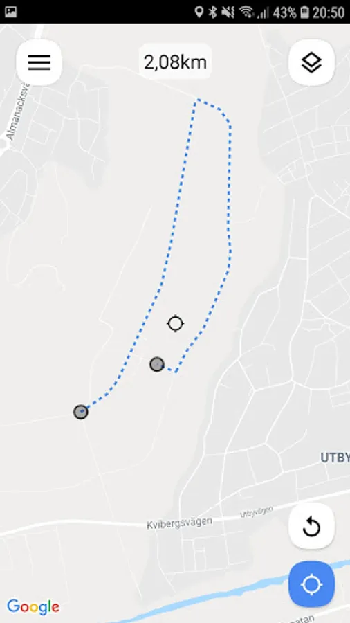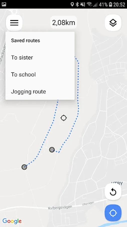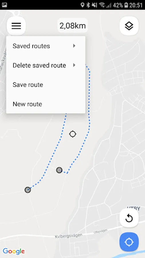 To create a route, simply move the center of the screen to the location where you want to put a point and then press the button in the bottom right corner. Then move the center of the screen to the next location and press the button to put the second point. Keep on until your route is complete.