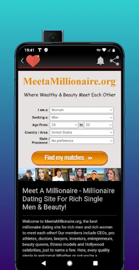 This app is designed to help users chat, meet, date and find love from several millionaires dating sites all in one place here. It saves time, phone space and prevent individual app downloads.