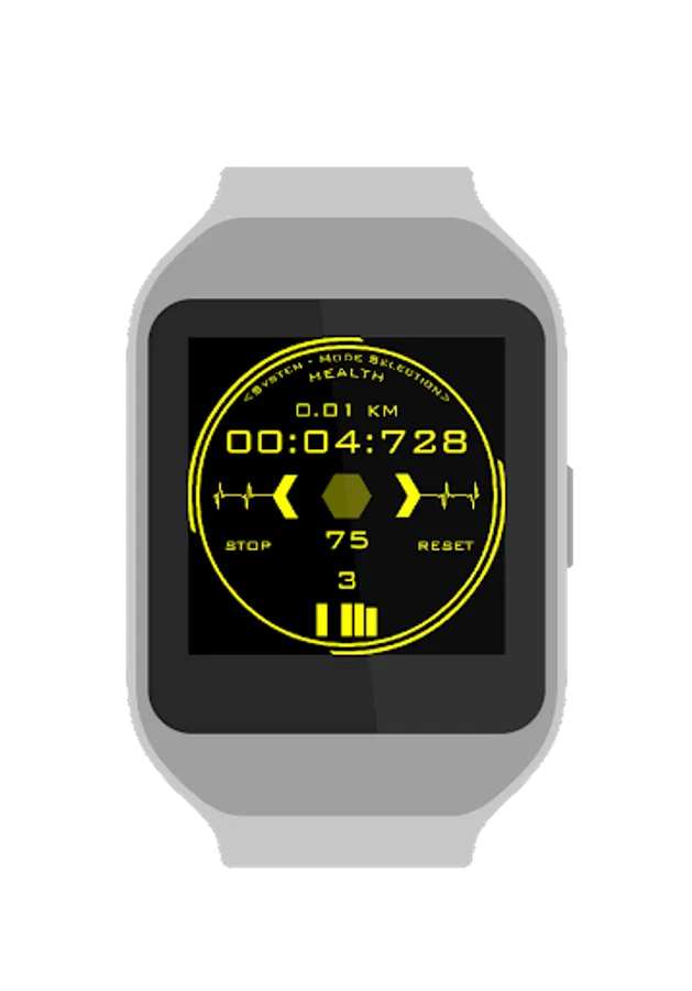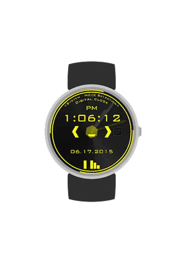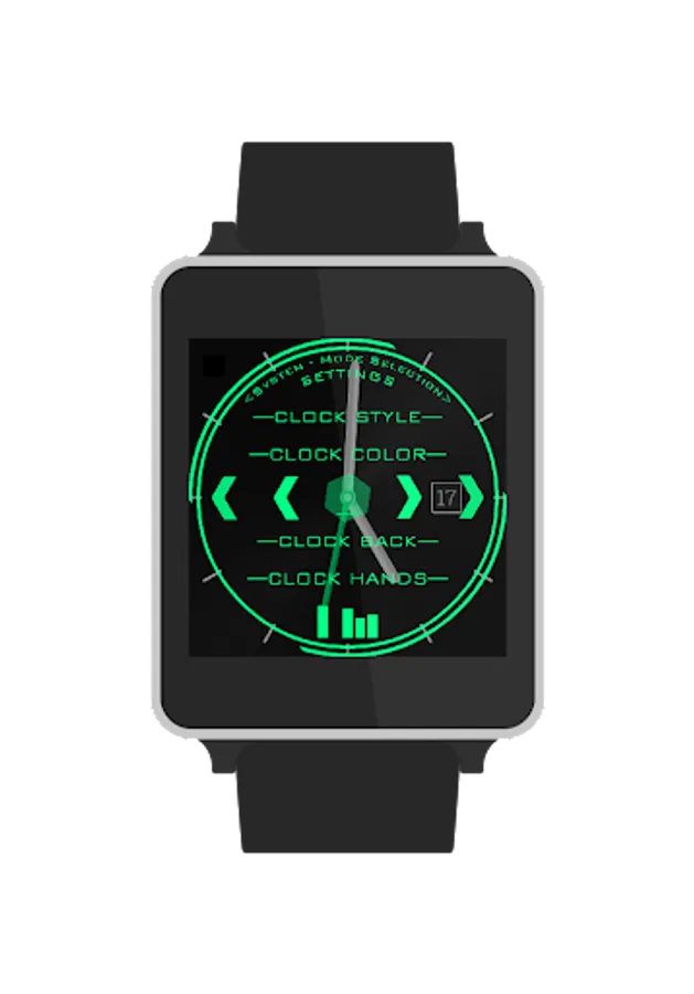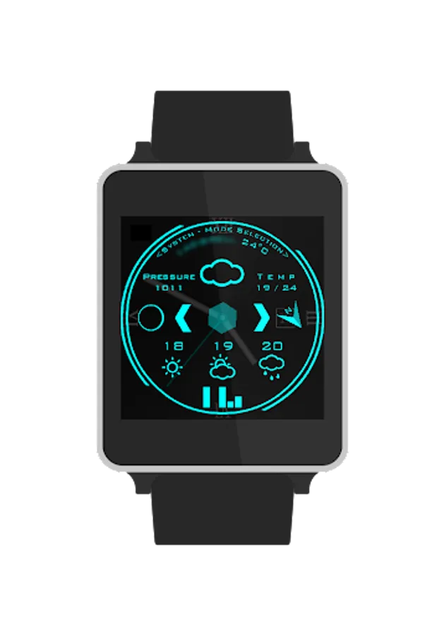 Press the center of the analog clock to open the digital interface. Press an option to activate it. Press the arrows to change mode. The hexagon represent the battery level!