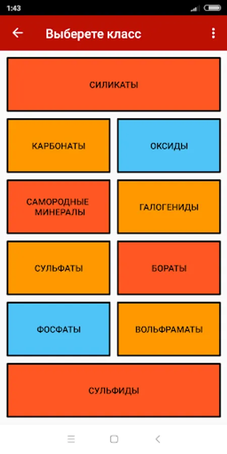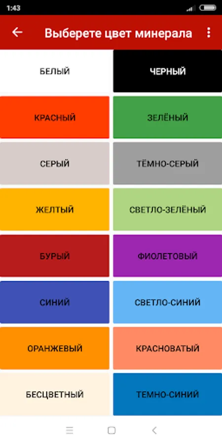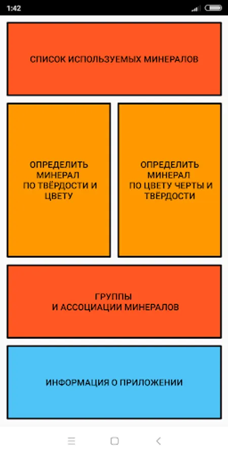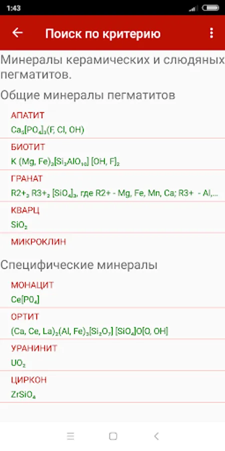 The determinant of minerals is created for students of geologists, meteorologists, geographers, all those who have a course in mineralogy. The annex contains more than 200 minerals. It is possible to search for the mineral in terms of its hardness, color and color. There are classifications of minerals by group and type of origin. There is an abundance of information about each mineral: color, hardness, formula, density, color of the line, image, syngony.