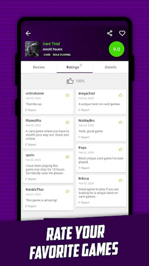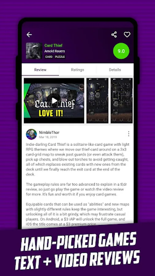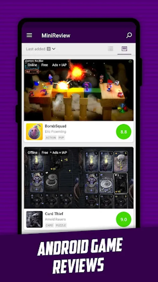 Download MiniReview, pick your favorite filters, and sort through an expanding catalog of the best Android game reviews. Check real in-game screenshots and detailed game information to find the exact games you want to play. Offline RPGs? Multiplayer Tower-Defense? Competitive Online Shooters? Portrait-Oriented Runners? We've got you!