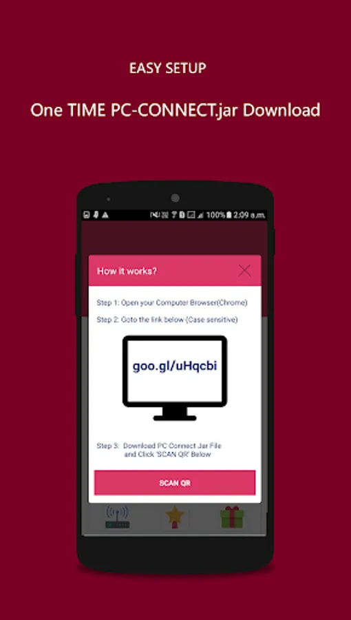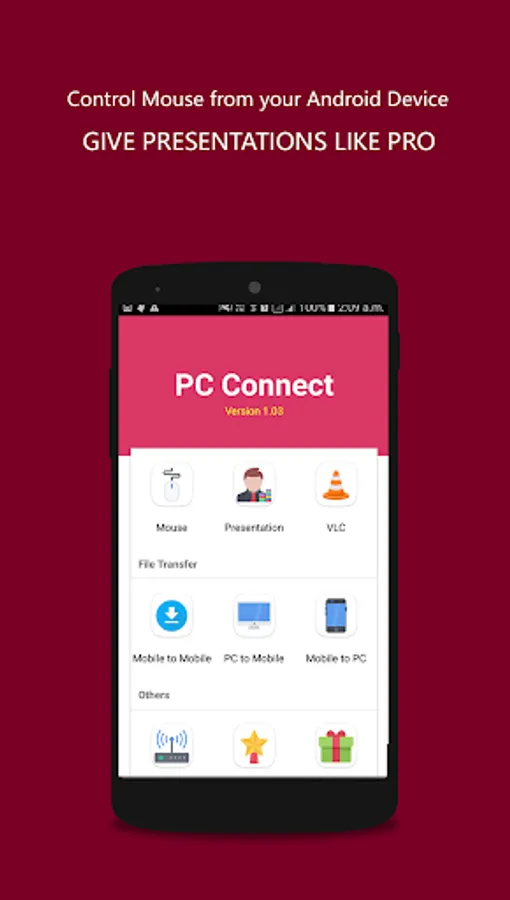 This app allows users to connect their PC to Mobile phone and hence control it. Users can create a virtual Mouse Pad for their Laptop/PC on their Mobile Phones and can then control it. It allows left click, right click, Playing Next song,Previous song, Pause and Mute Functions.