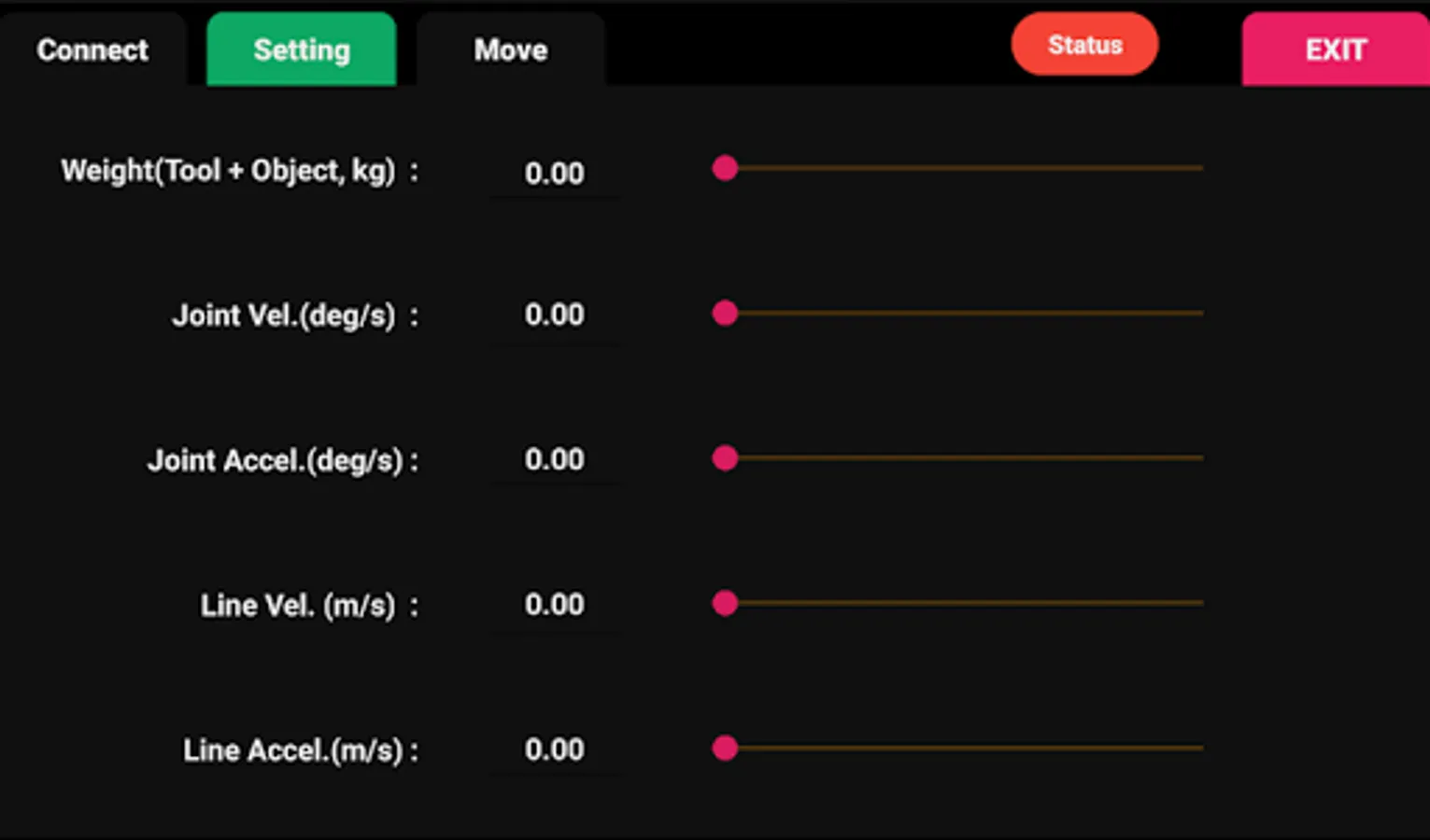 -Setting: Set the Weight (Tool + object, kg), Velocity, Acceleration.