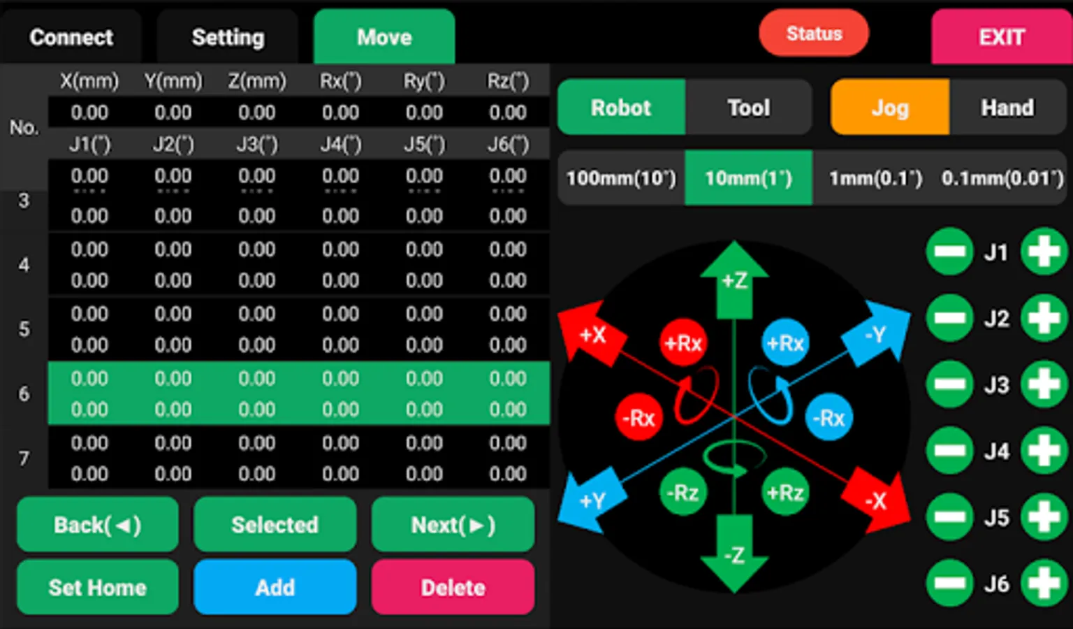 -Move: Move your robot and add positions and then, check the positions.