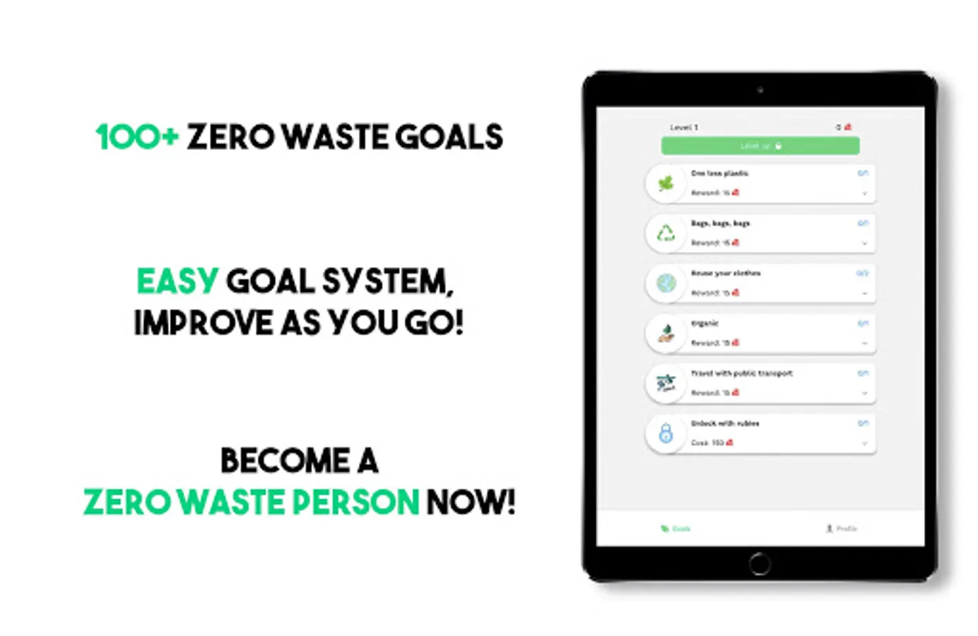 π Sustainability can be a challenge for many people: We don't know what we are doing right, or wrong, but yet we want to be sustainable, help the environment and become eco-friendly. With Zero Waste Goals, you will become eco-friendly and zero waste step by step. Remember, doing a little is 100 times better than doing nothing! π