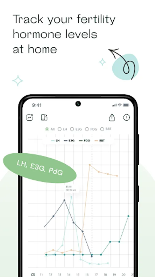 By pairing the Mira App with the Mira Analyzer and Fertility Wands, you can test your hormone levels through urine and get easy-to-understand, numeric results. Track Estrogen-Estradiol Metabolite (E3G), Luteinizing Hormone (LH), and Pregnanediol Glucuronide (PdG) concentrations. Get fertility scores and hormone concentrations after each test and easily compare your charts.