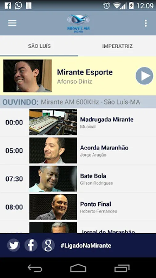 The slogan "Radio Maranhão" is a tribute to the work of the whole team - broadcasters, operators, technicians, producers and journalists - directly responsible for the quality of transmission and the daily content. These professionals are deservedly recognized both by professionals and by the local market as the best of Maranhão radio team.