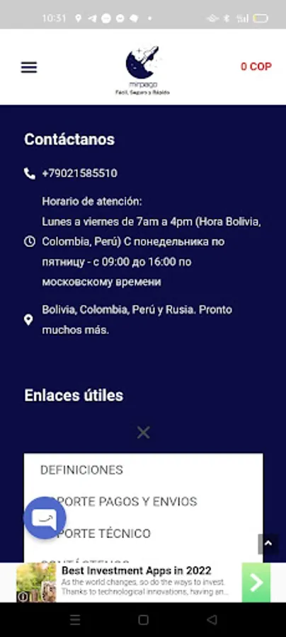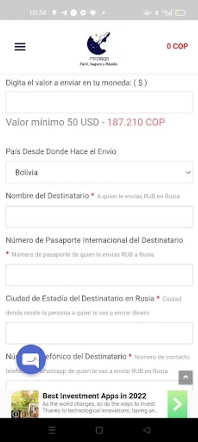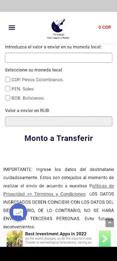 With responsible work in the countries of Bolivia, Colombia, Peru and the Russian Federation, it is our duty to help people affected by these current events, with the service of sending and receiving foreign currency in local currencies through our platform.