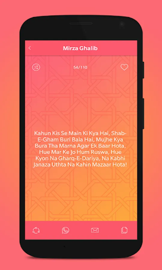 Mirza Ghalib Shayari app has facilities of sharing and also copying the Ghazals.