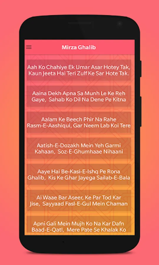 All the Urdu/Hindi Shayari lovers will find best of Mirza Ghalib in one app. Some of the Ghazals written by the legendary Mirza Ghalib.