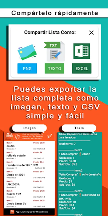 Search your lists by color tags. Toggle item states between: Purchased, Not Purchased, and Disabled. Export your list as an image or text with a professional presentation.