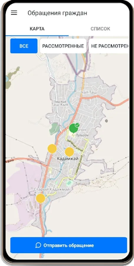 The Kadamjai Online Citizens' Appeal Map mobile application is aimed at improving reliable communication between Kadamjai residents and the Kadamjai City Hall, City Council and other government agencies. In addition, the mobile application will serve to improve the quality of municipal services in Kadamjai.