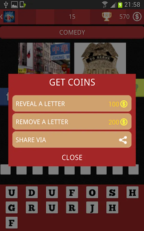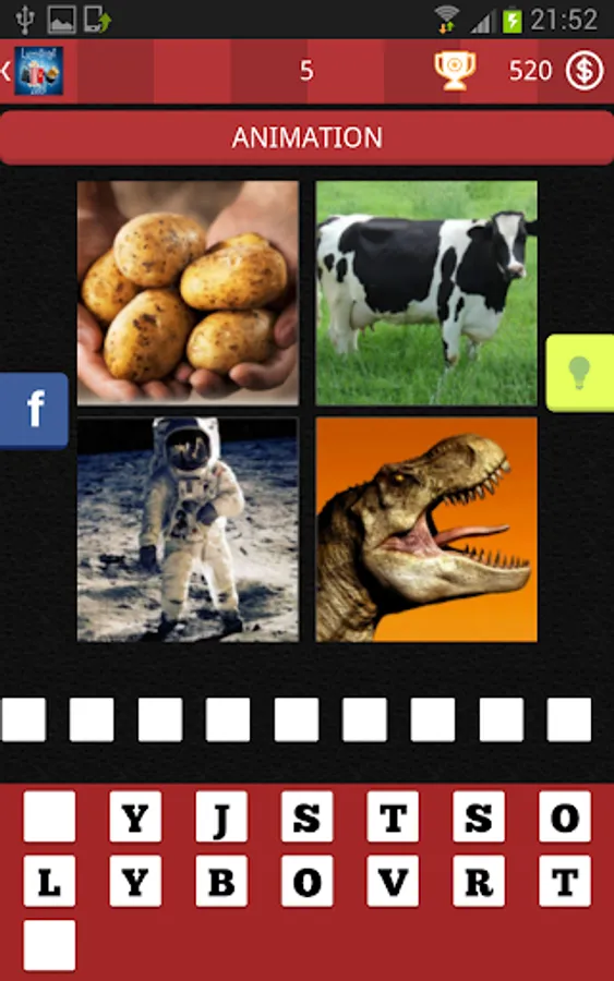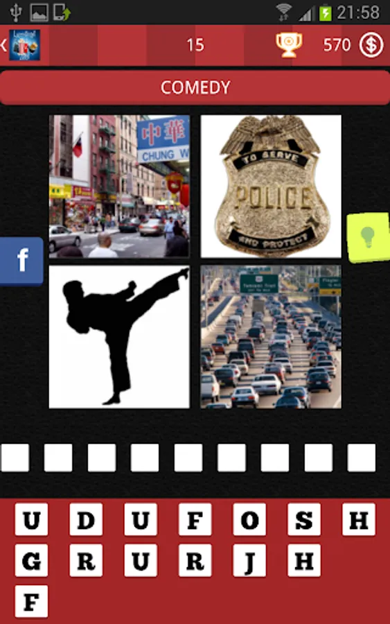 Easy game, especially for movies fans, where there are four images which refer to specific movie, there will be more movies added to the game. and there will be help icon which will make you reveal a character or remove a character and this icon is located on the left of the game page, in addition, there is a hint of the film type such as action or comedy or drama .... etc.
