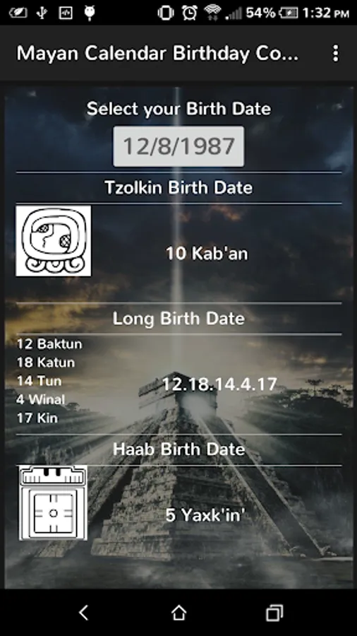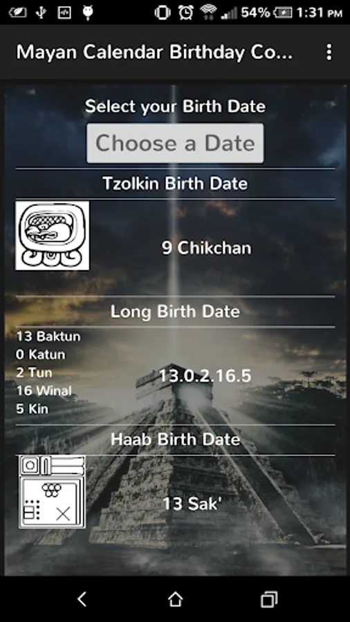 This application converts an entered Gregorrian Calendar date after April 21 1939 into 3 different Mayan Calendars dates. The Tzolkin Calendar, the Long Count Calendar, and the Haab Calendar
