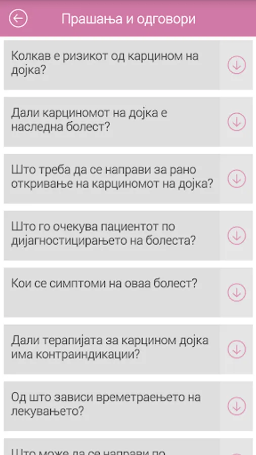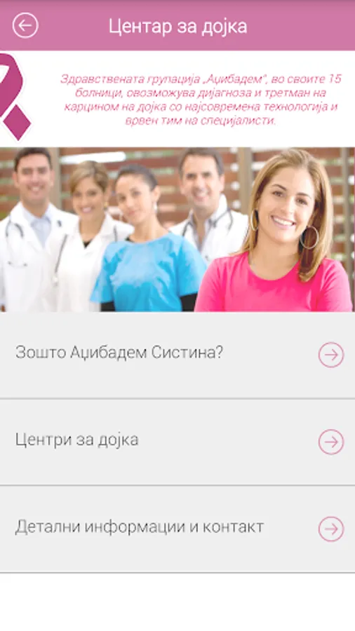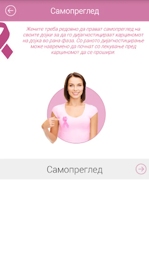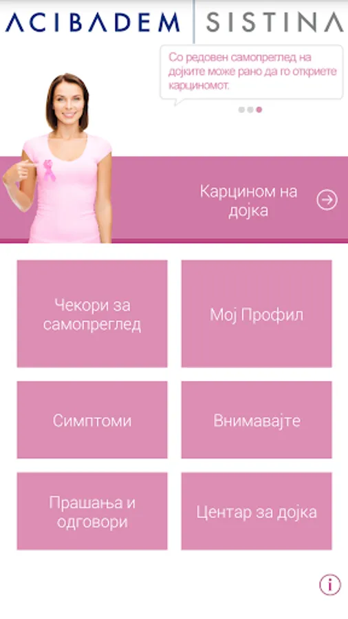Мобилната апликација "За здрави дојки" на Аџибадем Систина Ви овозможува за многу кратко време да научите како се прави правилен самопреглед на дојки. Освен водичот за самопреглед, можете да го внесете и датумот на последниот преглед, па кога ќе дојде време за следен преглед апликацијата ќе Ве потсети што треба да направите. Апликацијата Ви ги овозможува следниве услуги: