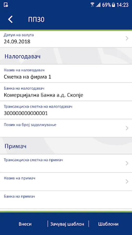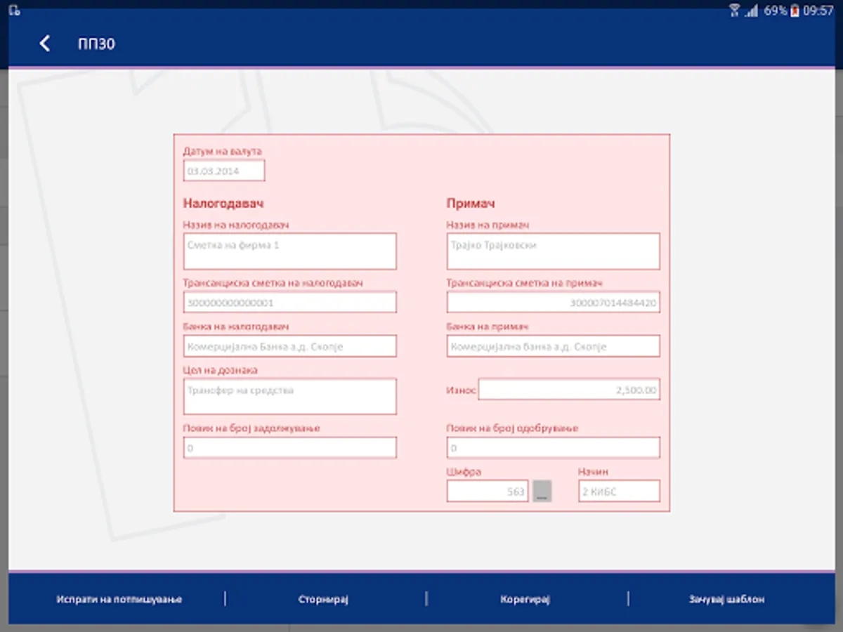 • transfer of funds from a Denar transaction account to other accounts in the payment system in the country (input, signing and sending for realization)