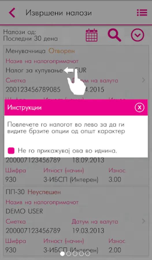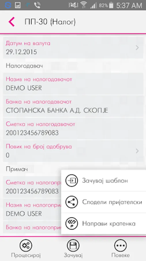 • Извршување на налози за плаќање преку стандардните ПП30 и ПП50 обрасци, со можност за избор од сопствените сметки (Мои сметки)