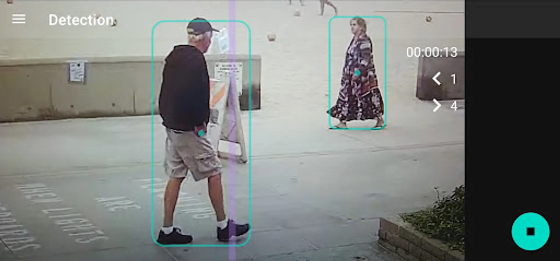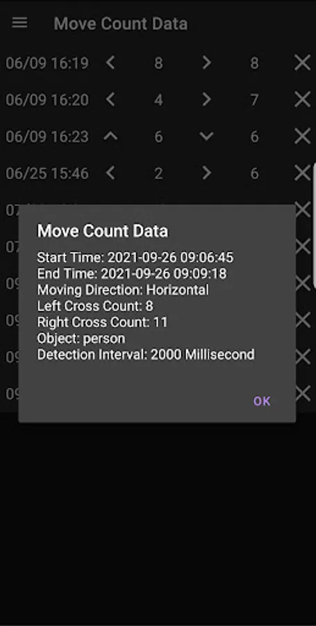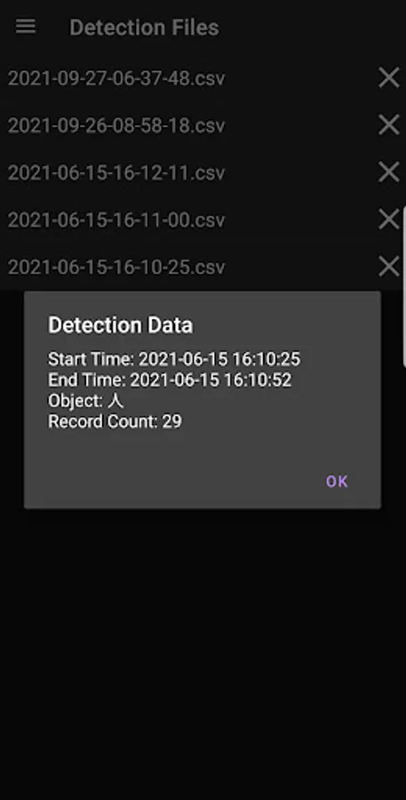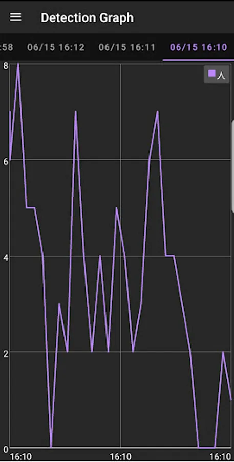 - Detection count mode collects the number of objects detected by the camera every interval. The app stores the data to a CSV file. It can also show the graph of the counts.