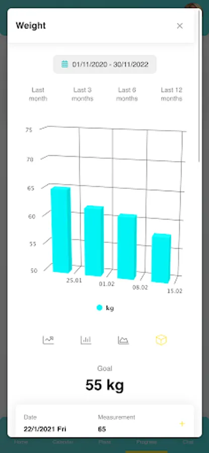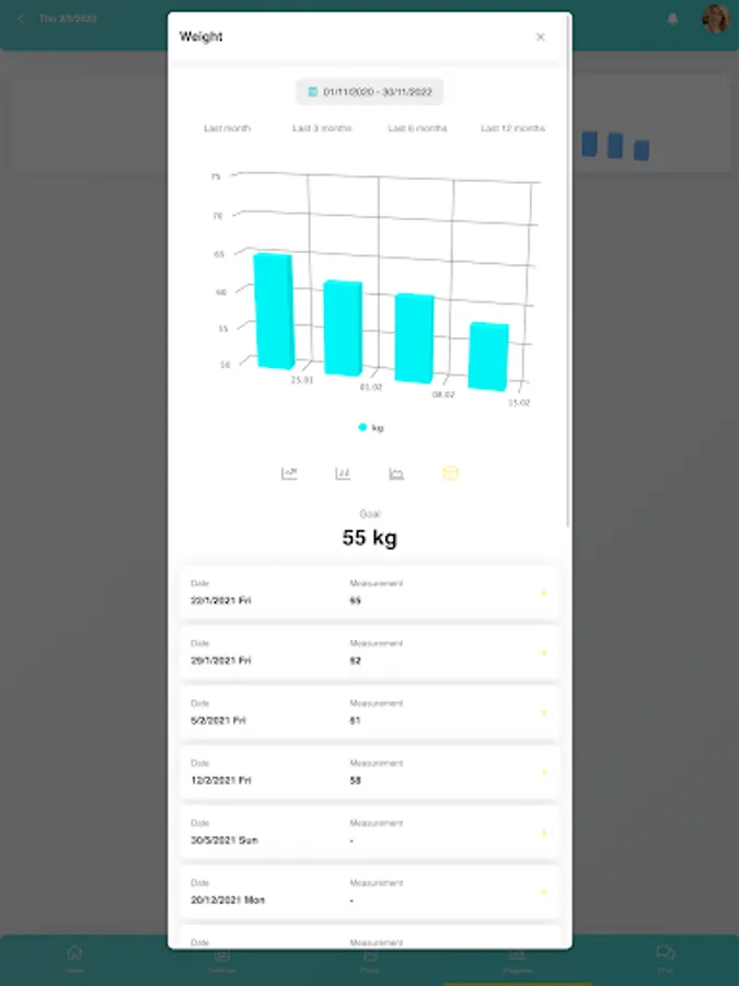 The coach can follow the client's progress with over 20 different measuring points, such as weight, blood pressure, circumference, sleep, etc. Clients will receive a push notification every time they should enter some measurement data. Clients can follow their progress with the help of informative graphs. The coach sees the same graphs and can conveniently monitor how the lients are evolving. The coach can also create an unlimited number of own custom measuring points.