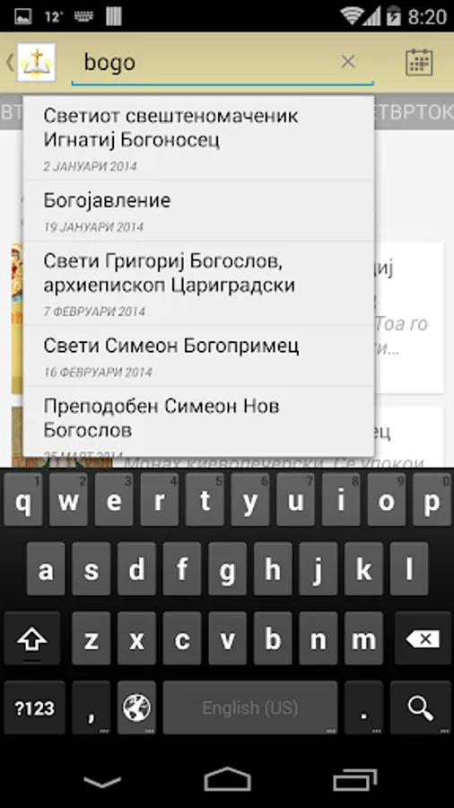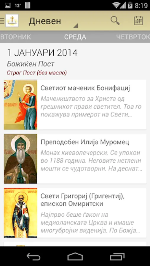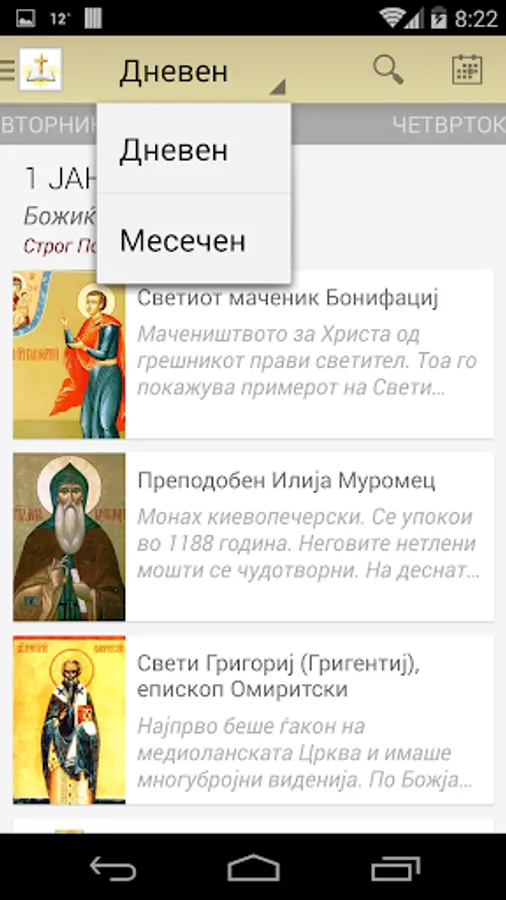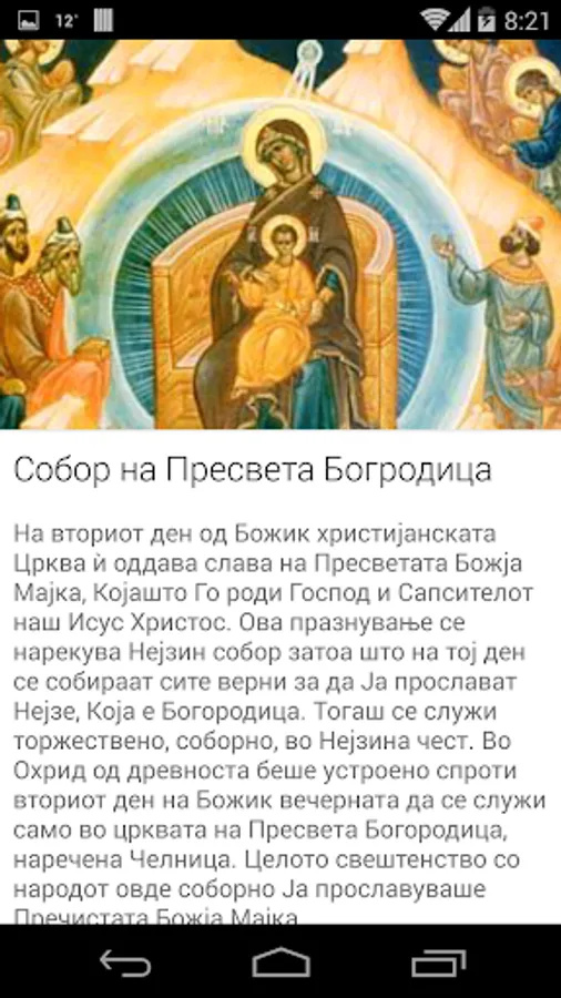 "Kalendarche"(or Kalendarce - Pravoslaven Kalendar) is a FREE Android app, that allows you overview of Holidays and Saints from Macedonian Orthodox Calendar (Makedonska Pravoslavna Crkva - Makedonski Pravoslaven Kalendar).