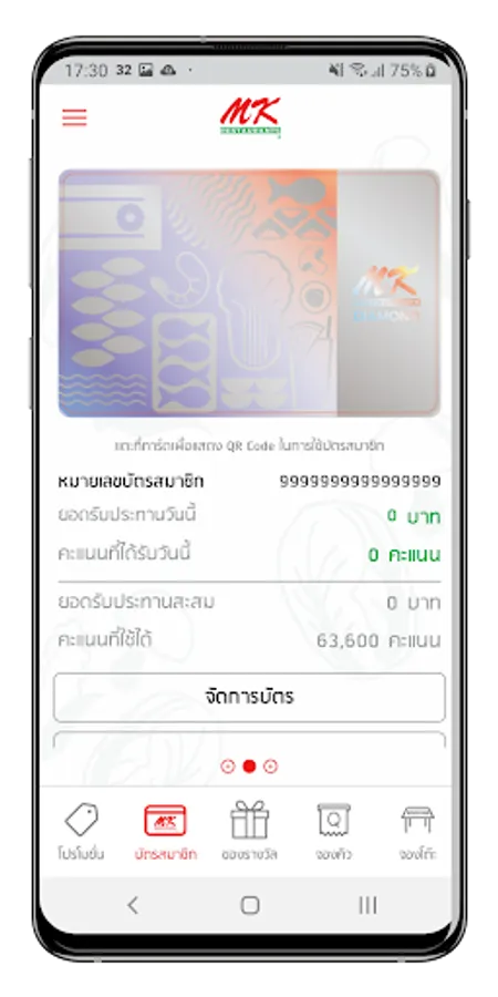 ระบบบัตรสมาชิก (E-Membership) : ให้คุณสะดวกยิ่งขึ้นไม่ต้องพกบัตร จัดการข้อมูลบัตรสมาชิก ตรวจสอบยอดการรับประทาน คะแนนสะสม แลกคะแนน และรับส่วนลดสมาชิกได้ด้วยตัวเองผ่านแอปพลิเคชั่น myMK