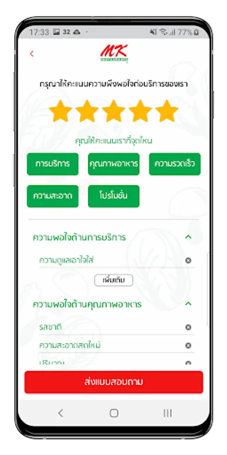 ระบบการประเมินความพึงพอใจ (Customer Satisfaction Survey) : ตอบรับทุกความคิดเห็นของคุณที่ได้รับจากประสบการณ์ในแต่ละมื้อสุกี้ด้วยวิธีการง่ายๆ ผ่านแอปพลิเคชั่น myMK